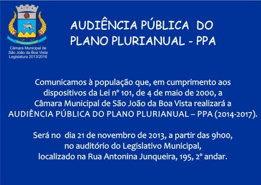 Na próxima quinta-feira, 21, será realizado na Câmara Municipal a AUDIÊNCIA PÚBLICA DO PLANO PLURIANUAL - PPA (2014-2017)