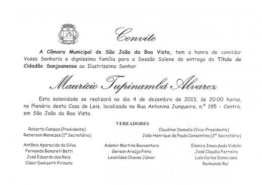A Câmara Municipal de São João da Boa Vista irá realizar nessa quarta-feira, 5, a entrega do Título Sanjoanense ao Ilmo. Sr. Maurício Tupinambá Alvarez, em reconhecimento aos serviços prestados a comunidade, sendo professor de natação. O título é de autoria do vereador Reberson Menezes.
