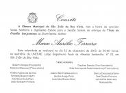 A Câmara Municipal realizará no dia 12 de dezembro de 2013, às 20h, a entrega do Título de Cidadão Sanjoanense ao Pró Reitor da Unifae, o Sr. Marco Aurélio Ferreira, em reconhecimento aos relevantes serviços prestados à comunidade sanjoanense.