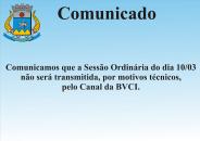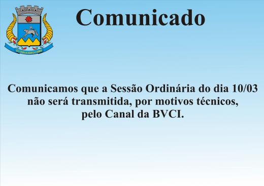 Comunicamos que a Sessão Ordinária do dia 10/03, não será transmitida, por motivos técnicos, pelo Canal da BVCI.