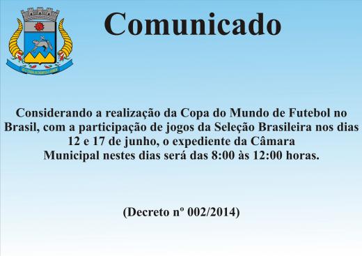 Considerando a realização da Copa do Mundo de Futebol no Brasil, com a participação de jogos da Seleção Brasileira nos dias 12 e 17 de junho, o expediente da Câmara Municipal nestes dias, será das 8:00 às 12:00 horas. (Decreto nº 002/2014)