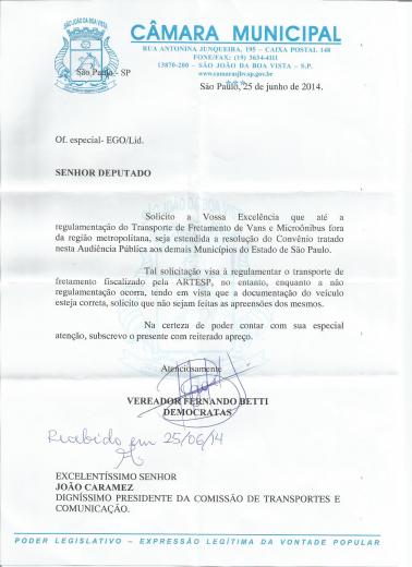 O Edil já esteve presente na ARTESP em companhia de outros três munícipes proprietários de vans, com o assessor parlamentar Mauriti e com a advogada Drª Renata, a fim de reivindicar o tráfego livre de vans, pois o Decreto nº 44035/2005 afirma que o veículo não é aceito legalmente como meio de transporte para fretagem.