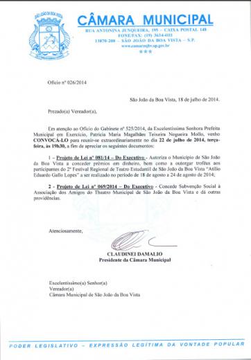 Projeto de Lei nº 081/14 – Do Executivo - Autoriza o Município de São João da Boa Vista a conceder prêmios em dinheiro, bem como a outorgar troféus aos participantes do 2º Festival Regional de Teatro Estudantil de São João da Boa Vista “Atílio Eduardo Gallo Lopes” a ser realizado no período de 18 de agosto a 24 de agosto de 2014. Comissões de Justiça e Finanças.